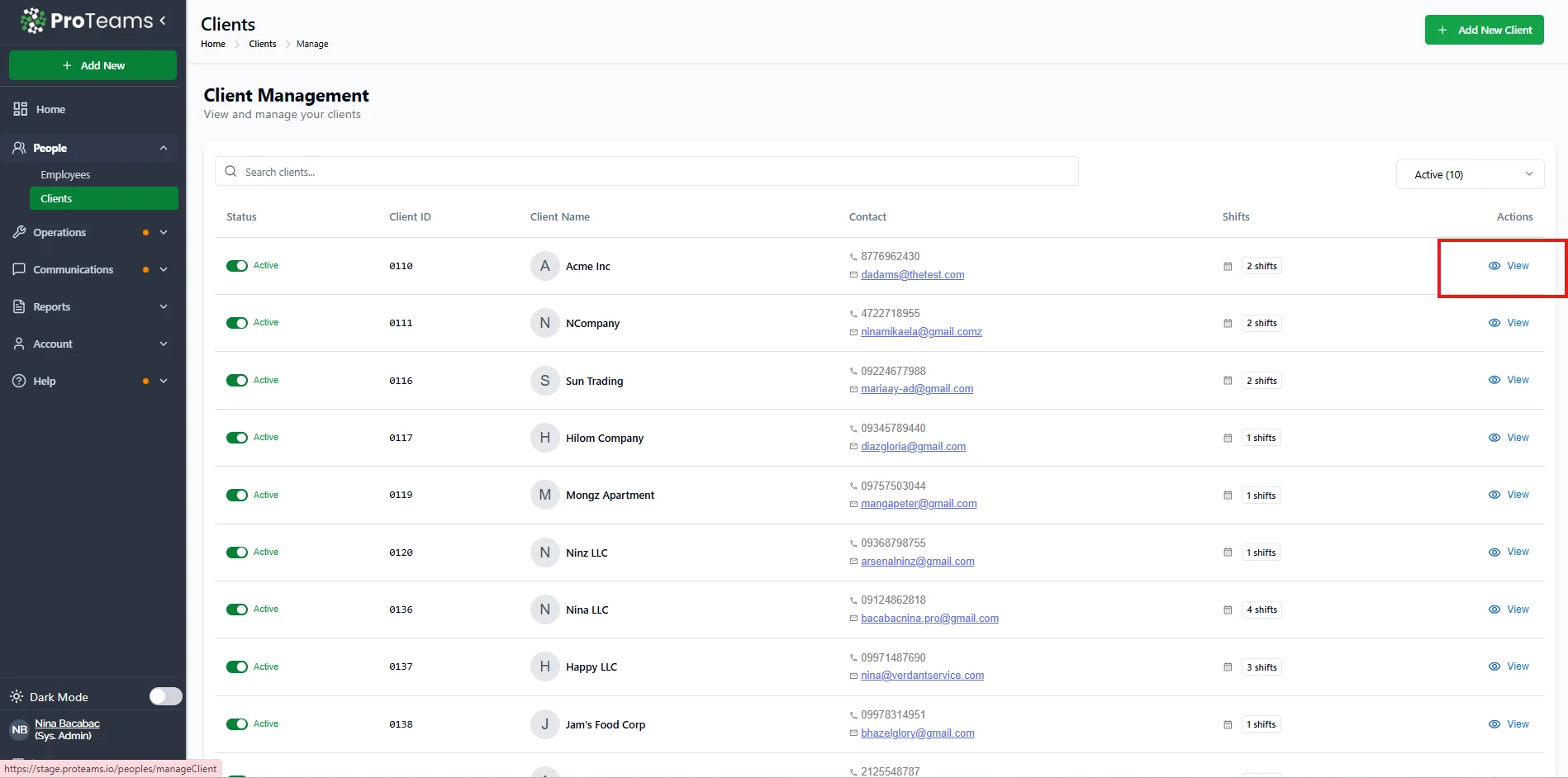 This page shows all your clients, their status, contact details, and assigned shifts.