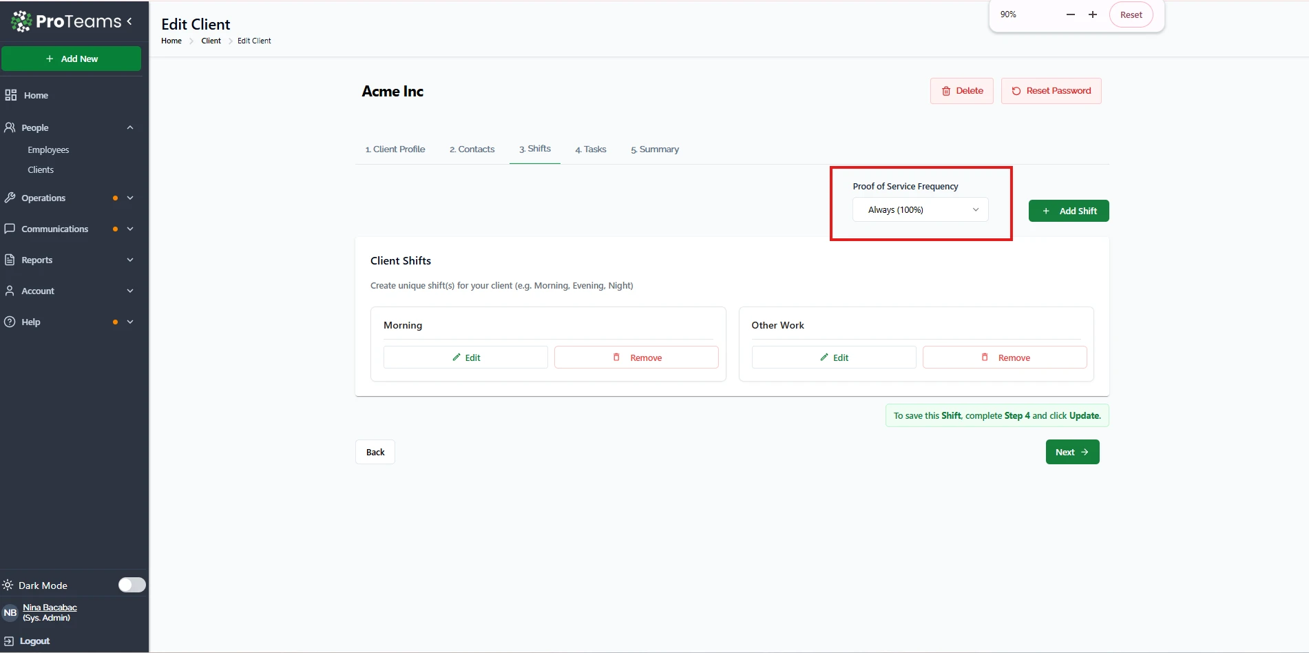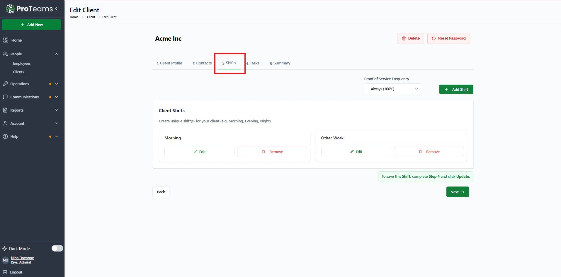 - You will see all shift types assigned to that client (e.g., Morning, Evening, Other Work)