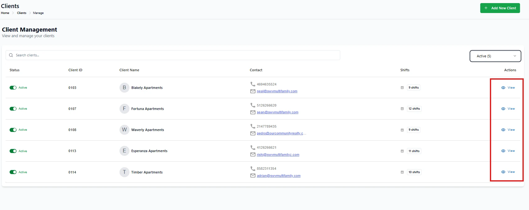 The Client Shifts tab displays all shifts created for the client. Each shift is shown as a card with its name and available actions.