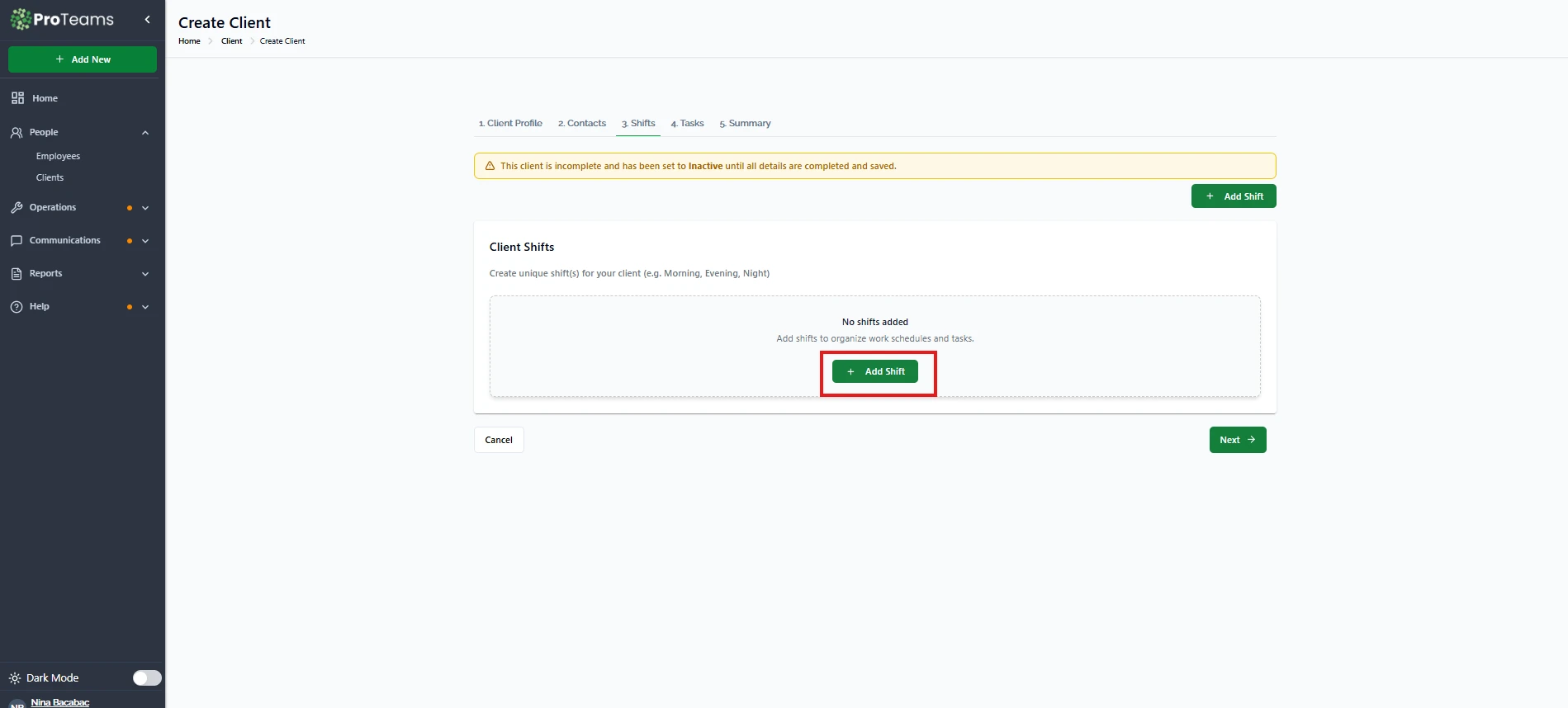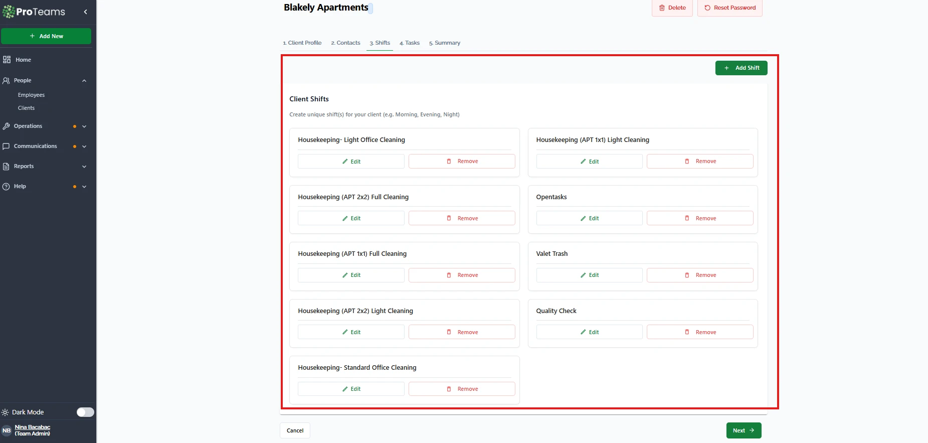 A client shift in ProTeams defines the type of service being performed at a client’s site — not just when, but what. Shifts are how you connect the right tasks to the right crew for the right client, every time.