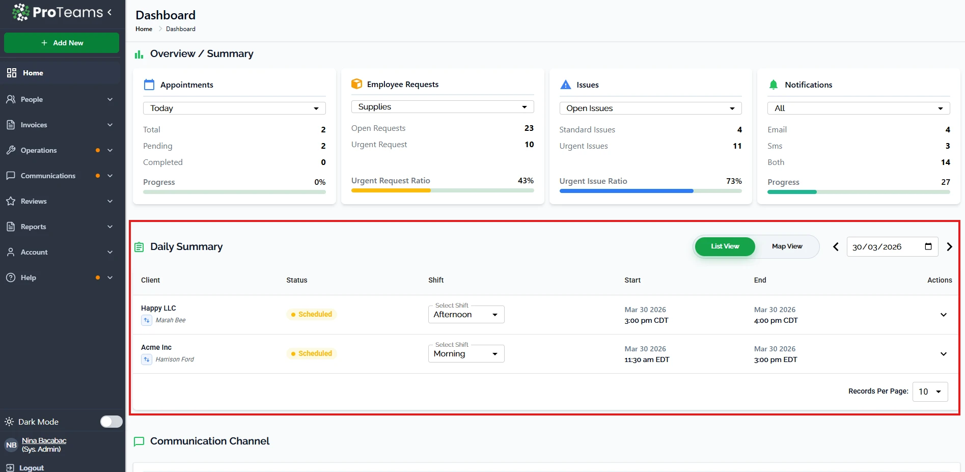 The Overview Summary tells you what’s happening. The Daily Summary tells you where it’s happening — a ground-level view of every shift scheduled for today, who’s assigned, and what’s been completed.