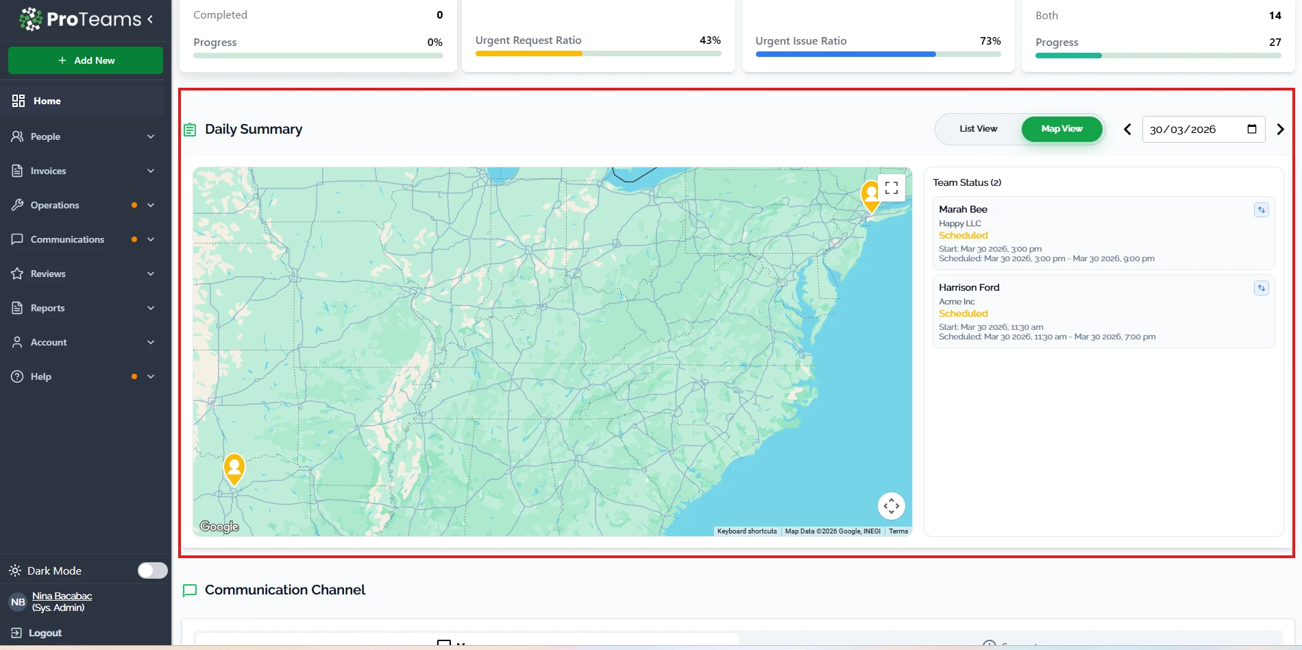 The Daily Summary gives you a clear view of all scheduled work for a selected day. It shows who is assigned, where they are going, and when each job starts and ends. You can switch between List View and Map View depending on how you