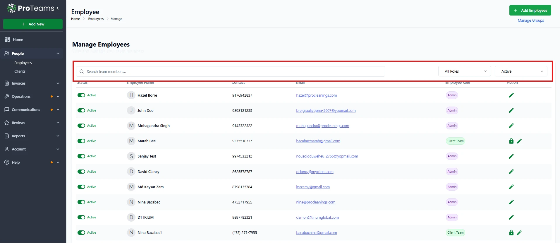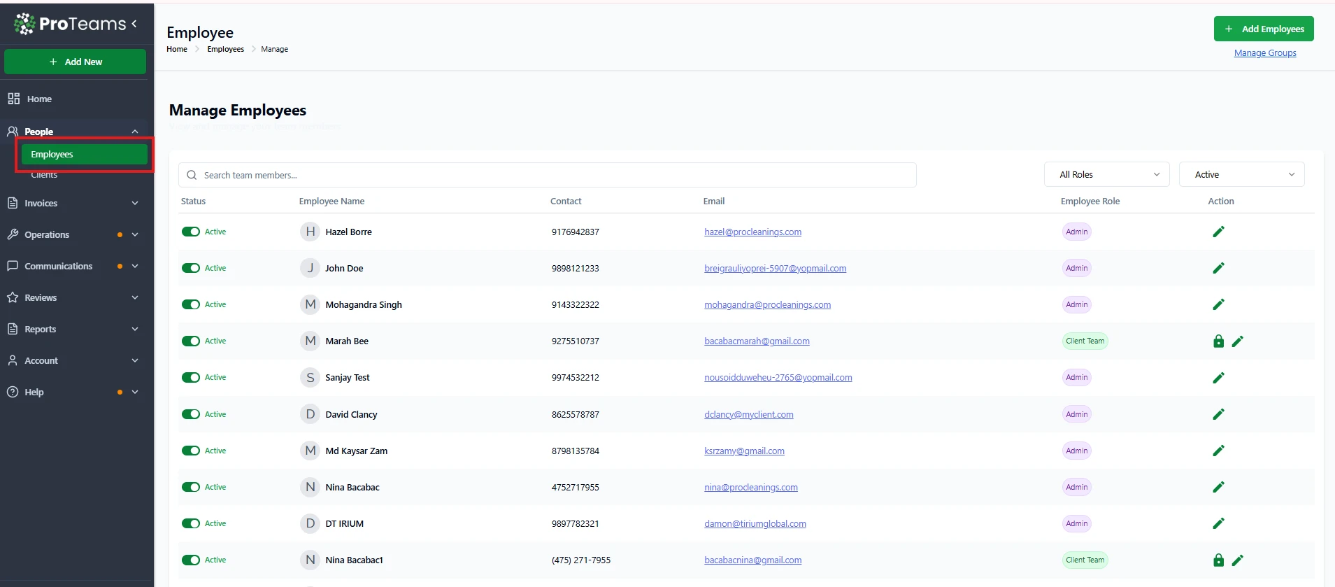 Once employees are added to ProTeams, you can manage their access, roles, and status from the Manage Employees page.