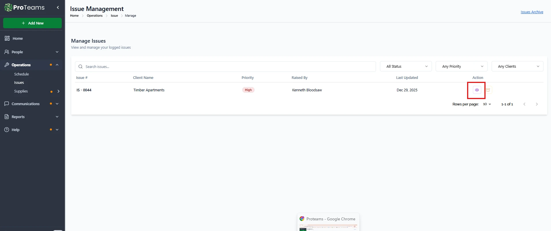 - Open the issue from Issue Management by clicking the View (eye) icon.