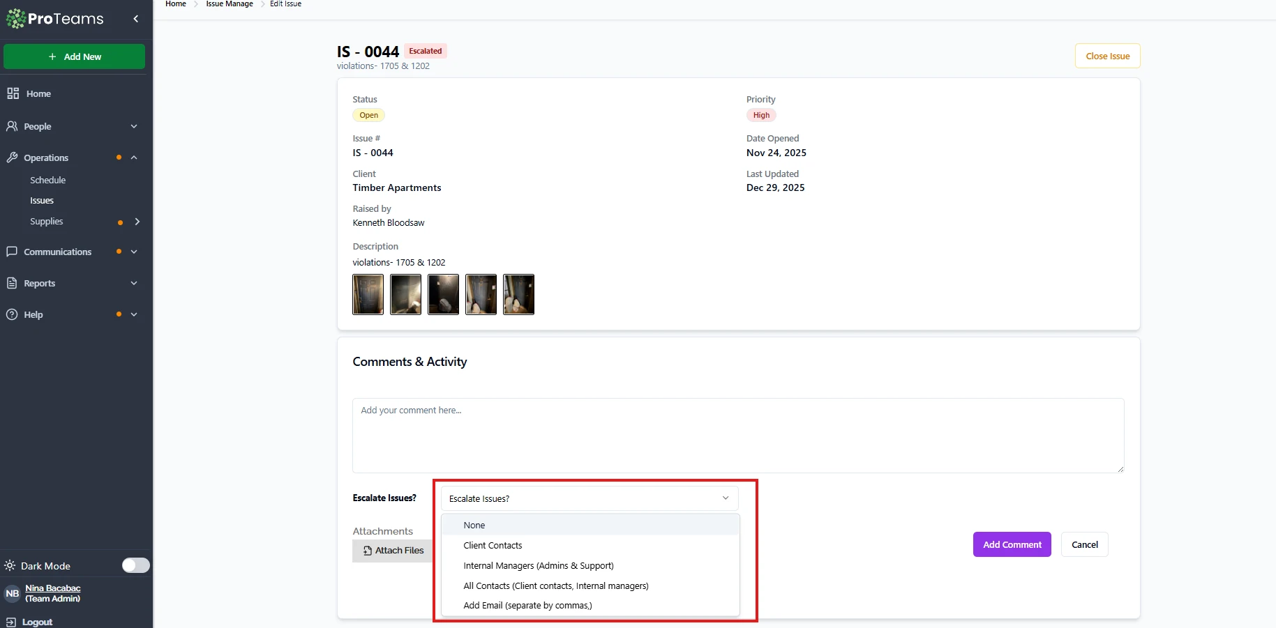 ProTeams allows you to invite both internal team members and external contacts to collaborate on an issue directly from the Issue Details view. This is done using the Escalate Issues? option inside the Comments & Activity section.