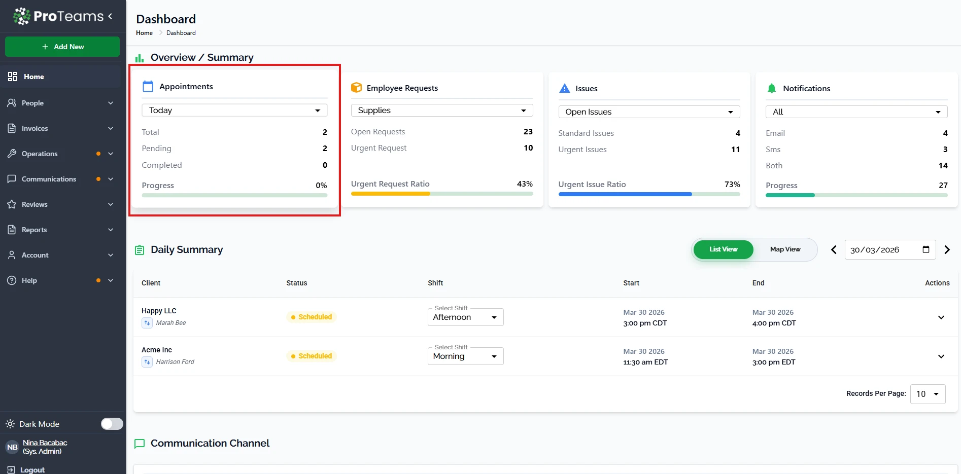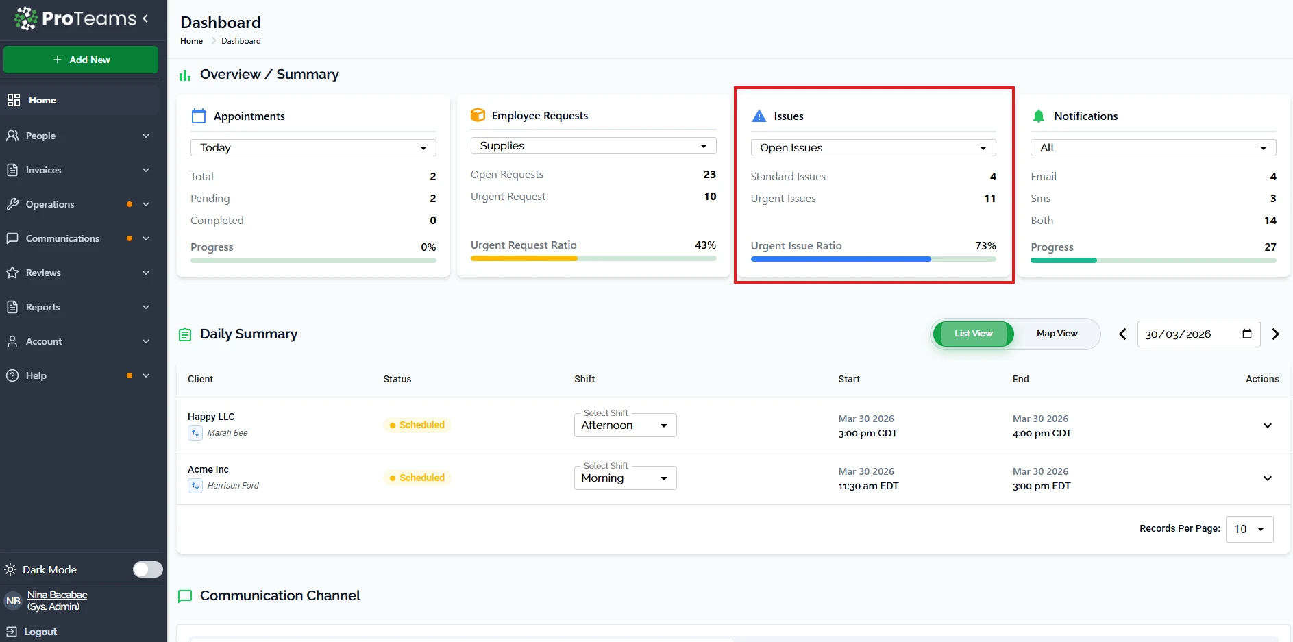 The Overview Summary section of the ProTeams dashboard gives users a real-time snapshot of what is happening across the platform. This area is designed to surface the most important operational data at a glance so users can immediately identify priorities, bottlenecks, or urgent actions.