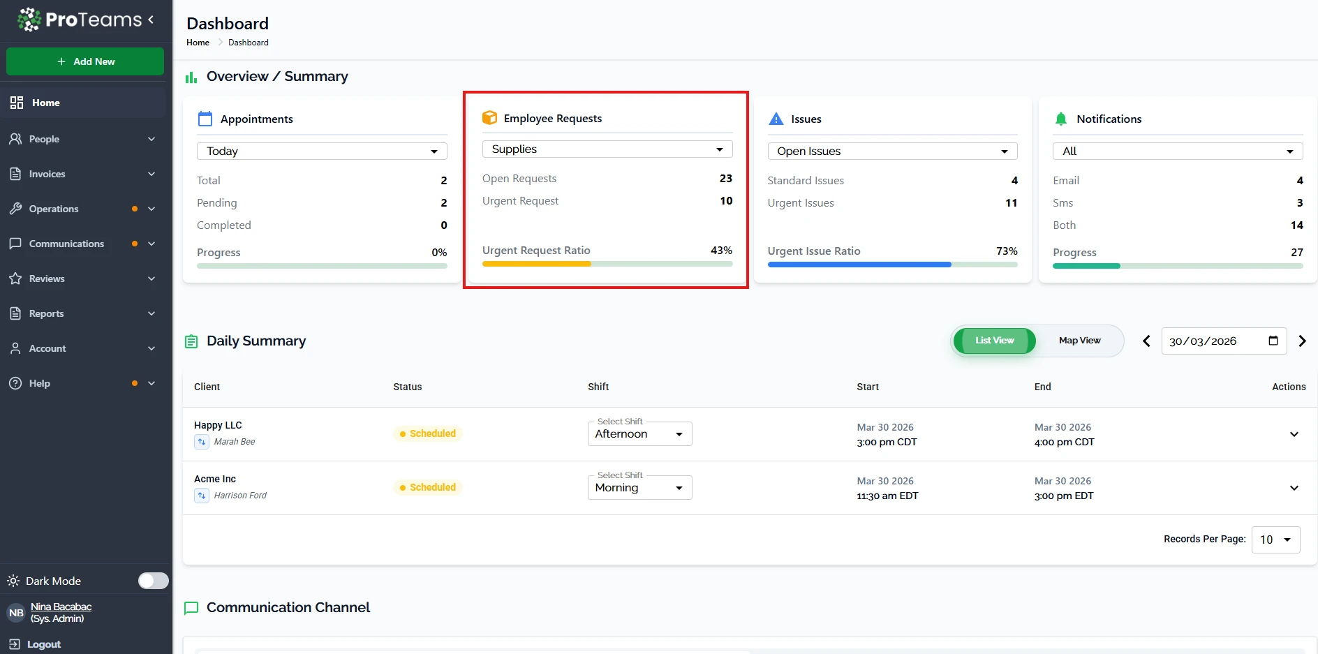 The Employee Requests card tracks internal requests submitted by team members, such as supply requests.