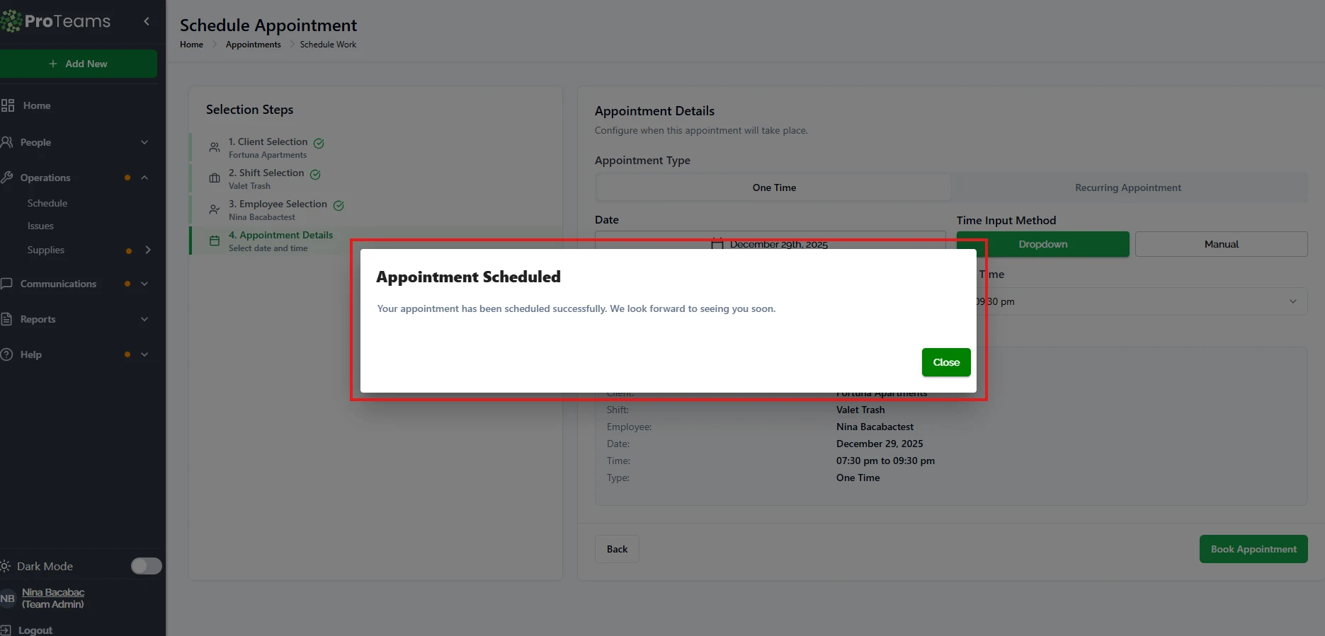After you book an appointment, you need to know it actually saved. The Scheduled Appointment confirmation is the moment ProTeams tells you it’s done — clearly, before you move on.