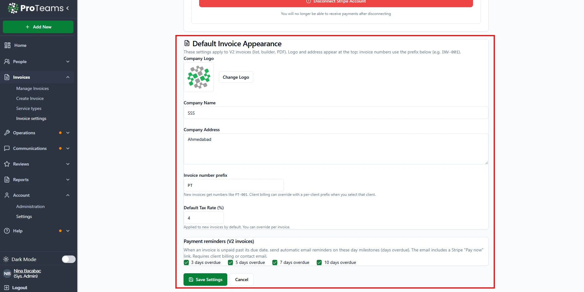 Set your invoice prefix and tax rate early. This keeps your billing clean and avoids manual edits later.