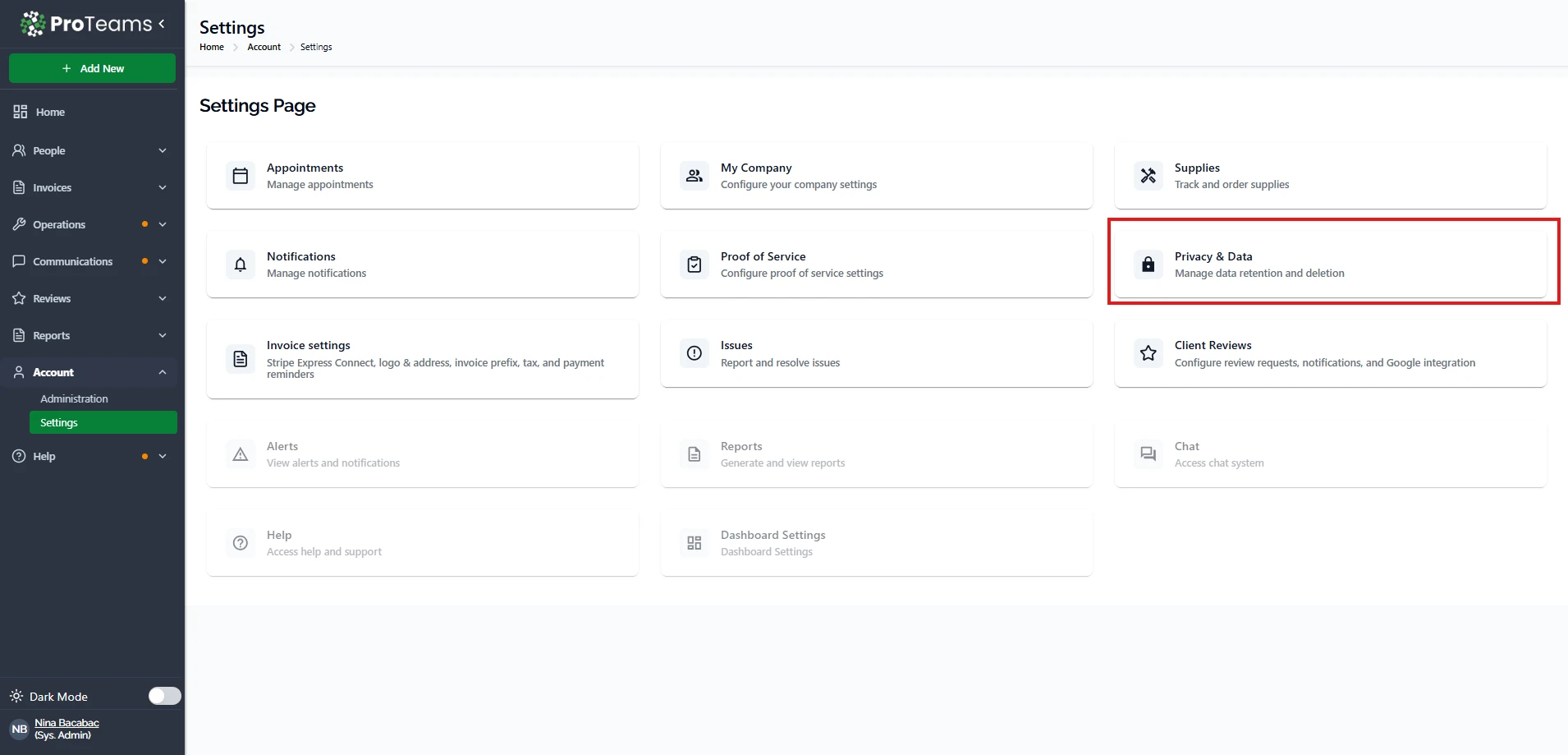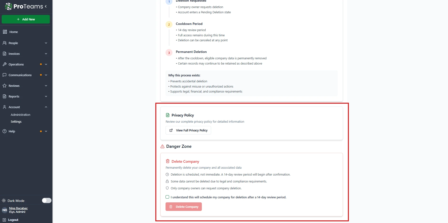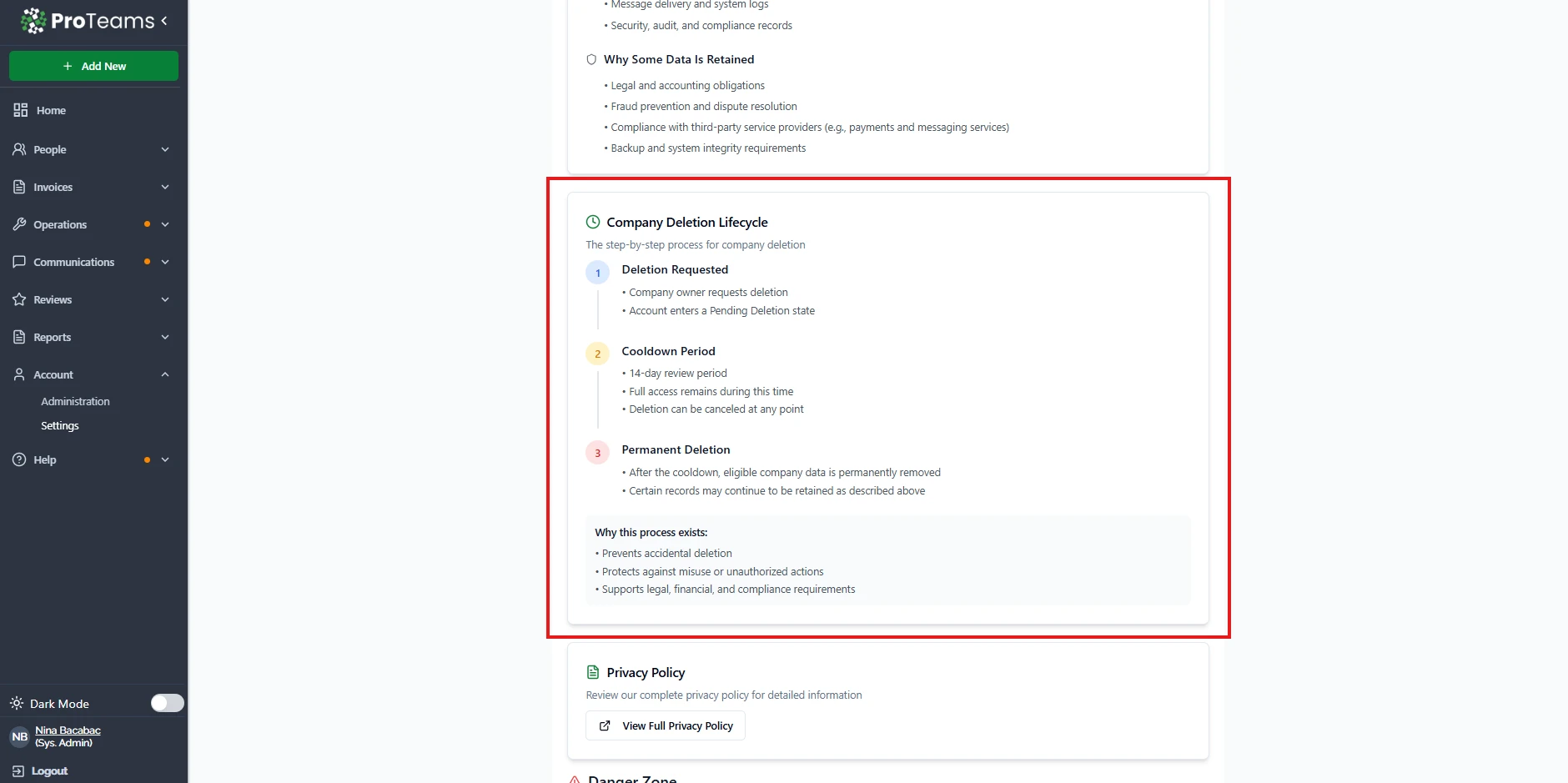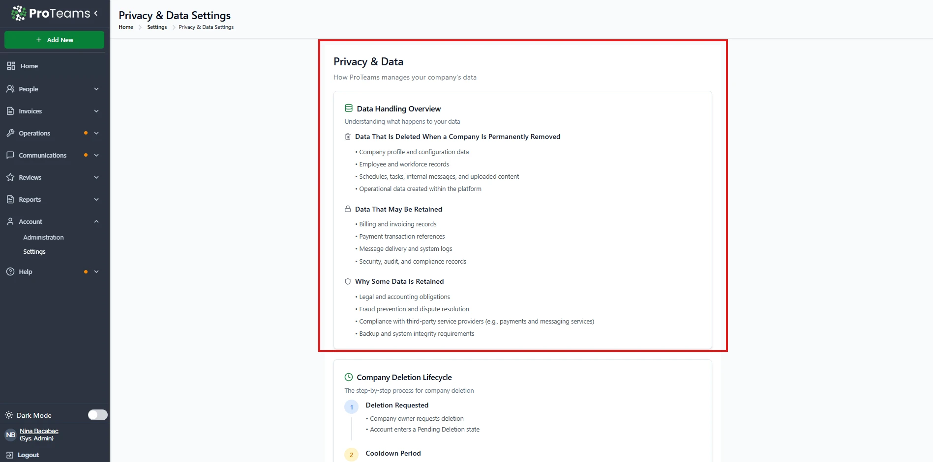 Privacy & Data settings control how your company’s data is handled, stored, and deleted in ProTeams. It gives you visibility into what happens to your data and allows you to manage company deletion when needed.