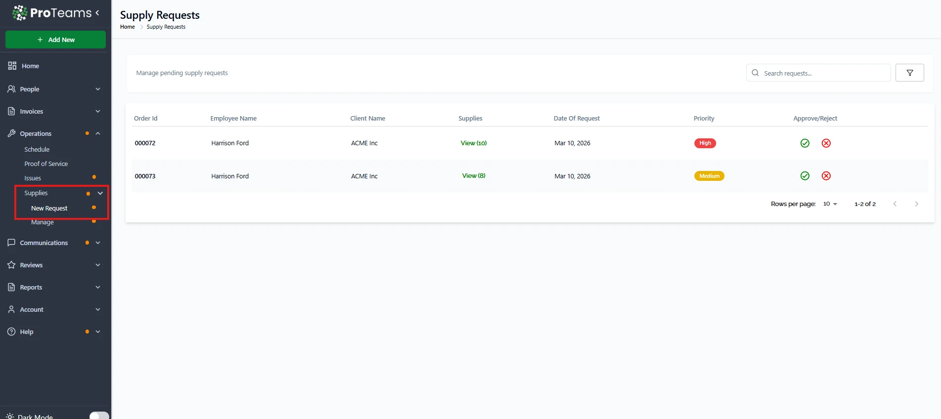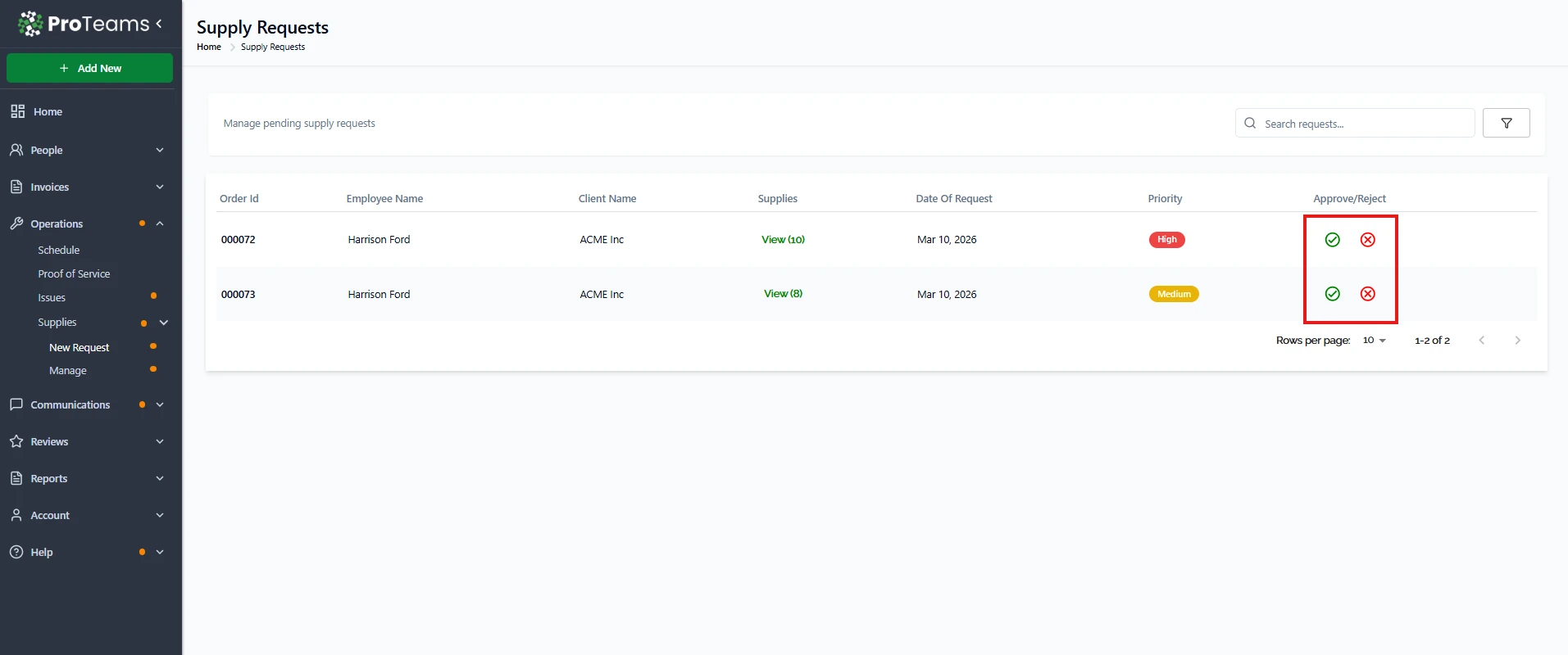 ProTeams allows managers and admins to review, approve, or reject supply requests directly from the Supply Requests page in the web portal.