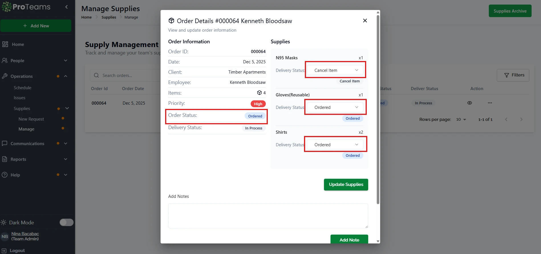 ProTeams allows managers to update both item-level and order-level statuses for approved supply requests. These updates are visible to the entire team, ensuring everyone stays informed on supply progress, delivery status, and any changes that may affect operations.